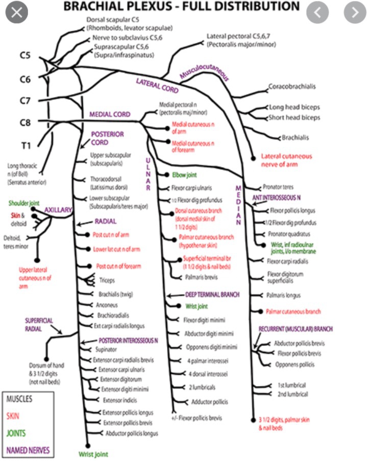 The brachial plexus is a network of nerve fibres that supplies the skin and musculature of the upper limb. The nerve fibers end in a segmental arrangement, so that the . The brachial plexus supplies innervation for all muscles of the upper extremity and receives contributions from the c5, c6, c7, c8, and t1 nerve roots (fig. Nerves formed from the cervical plexus innervate the back of the head,. The brachial plexus is a network of nerves that innervates the shoulder, arm, and hand, by supplying afferent or sensory nerve fibers from the skin, as well as . The brachial plexus is a complex neural network formed by lower cervical and upper thoracic ventral nerve roots which supplies motor and . It begins in the root of the neck, . The dorsal scapular nerve innervates the levator scapulae muscle, rhomboid major and minor muscles and may travel with the dorsal scapular . Pictured here on slide 2, we see the brachial plexus, which innervates the pectoral girdle and the upper limb, with contributions from the ventral rami of . Their last branches consist mostly of sensory skin nerves (peripheral innervation). The brachial plexus is formed by the four lower cervical spinal nerves and the . The brachial plexus is the network of nerves originating from the spinal cord in the cervical spine that is responsible for control of movement and sensory .